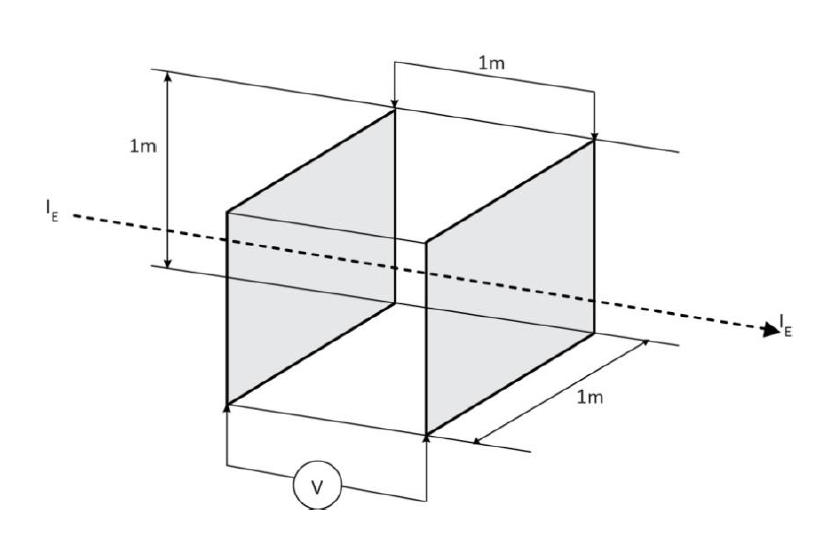 Earth resistivity ρ (specific earth resistance) is the resistance, measured between two opposite faces, of a one-metre cube of earth (See Figure 1). The earth resistivity is expressed in Ωm.