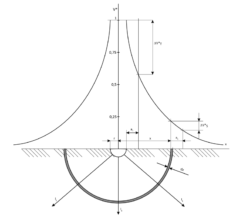 The earthing voltage and the distribution of the earth surface potential, arising from fault current flowing in the earthing system, are important parameters for protection against electric shock. The basic relations are shown on the earth model presented in the Figure 3.