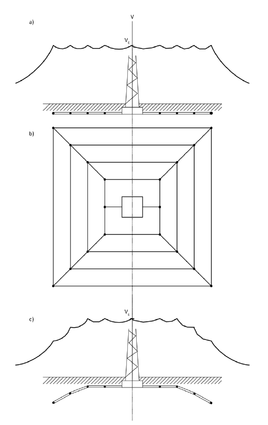 Meshed electrodes increase the surface area that experiences a voltage rise as the result of current flow to the earth electrode. Over the area of the mesh, equipotentiality exists, but at the periphery of the electrode there is a potential gradient as shown in Figure 6a. Although there is no touch potential – because the mesh extends beyond any metal structure by more than a meter – dangerous step voltages can occur. This situation can arise, for example, in the earthing system of a substation. In order to avoid this, the outer elements of the meshed earth electrode should be placed at a greater depth than the rest of the grid (Figure 6c).