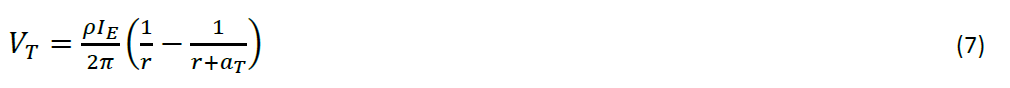 A similar relationship can be described for any other distances x and a. Particularly for x = r and a = aT = 1 m, formula (6) enables the calculation of the touch voltage, i.e. the voltage between a palm and a foot of a person who is just touching the earth electrode or metal parts connected to it:
