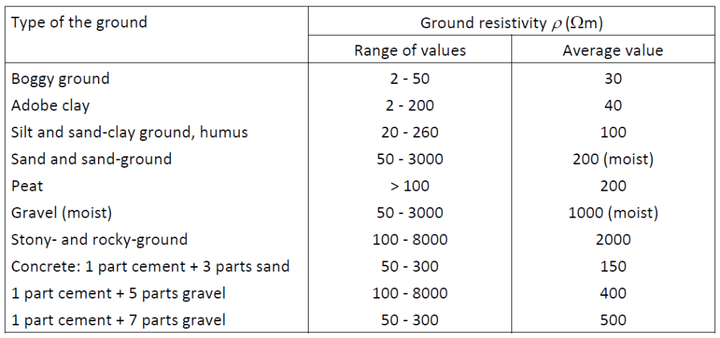 Table 1 – Ground resistivity ρ for various kinds of the soil and concrete [2, 4].