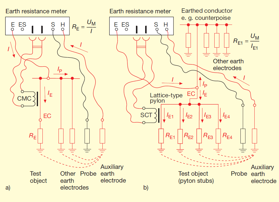 Figure 10b) shows the measurement circuit used when dealing with a steel-lattice electricity pylon that cannot be electrically disconnected from the earthed conductor (e. g. counterpoise, PEN conductor or neutral conductor). As the pylon structure serves as the earthing conductor EC, it is clearly not possible to clamp a CMC around the earthing conductor as in figure 10a). In this case, measurements are made by consecutively clamping a splitcore transformer SCT (Fluke EI-162BN7)) around the four pylon legs that are connected to the four pylon stubs that act as earth electrodes. The earth resistance meter displays the resistances RE1 to RE4 consecutively. The resulting earth resistance RE of the four mast feet, which are connected to one another through the steel lattice structure, can be calculated by equation (5):