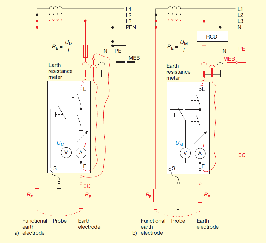 There is a wide degree of variation in the internal circuitry of the measuring instruments used and the layout and arrangement of the external measuring circuits. However, a common feature of all the methods is that they determine the earth impedance by measuring the voltage across the earthing system for a known test current. Leads that carry the test current outside of the instrument are shown in red in the diagrams.