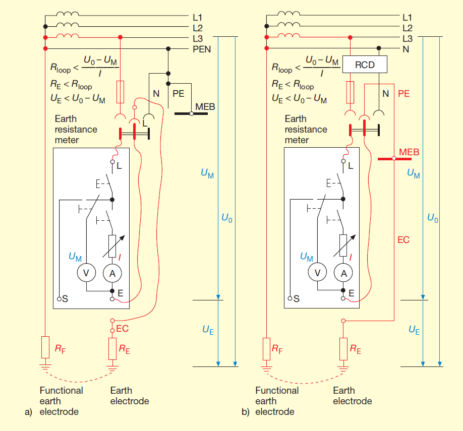 - b) Installation with TT system EC earthing conductor; RCD residual current device; I test current; MEB Main earthing busbar; RF resistance of functional earth; RE earth resistance being measured; UM test voltage