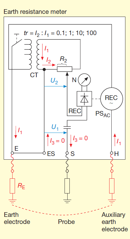 The AC power source PSAC is located between the connection point for the earth electrode under test (socket E) and that for the auxiliary earth electrode (socket H). The AC source is connected in series with the primary winding of a current transformer CT. Connected to the secondary winding of the current transformer is a variable voltage divider. The setting chosen for the left part of the divider R2 (‘reference resistance’) is displayed on the scale on the voltage divider’s control unit. A null detector N with a rectifier REC in series is located between the variable tap point of the voltage divider and the connection point for the probe (socket S). The rectifier is driven by the AC power source. A capacitor C prevents any DC current from flowing across the probe. One end of the voltage divider is connected to the earth electrode being measured via the instrument sockets ES and E. The transformation ratio tr of the current transformer can be switched to achieve the required measurement range.