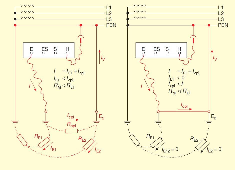 - a) Small distance and therefore small coupling resistance Rcpl between the earth electrode under test E1 and a second earth electrode E2 that is connected to the PEN conductor.