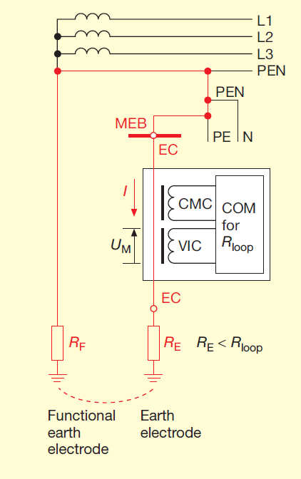 The resistance measurement displayed on the meter includes the resistance to earth of the functional earth and the resistance of the PEN conductor. If they were accurately known, these values could be subtracted from the resistance displayed on the meter. However, they are difficult to determine, because the functional earth in a TN system comprises not only the functional earth electrode shown in figure 7, it is also connected to numerous earths in the consumer installations of neighbouring buildings. The error that is introduced by measuring these additional resistances results in an overestimation of the earth resistance, yielding a value that errs on the side of safety.