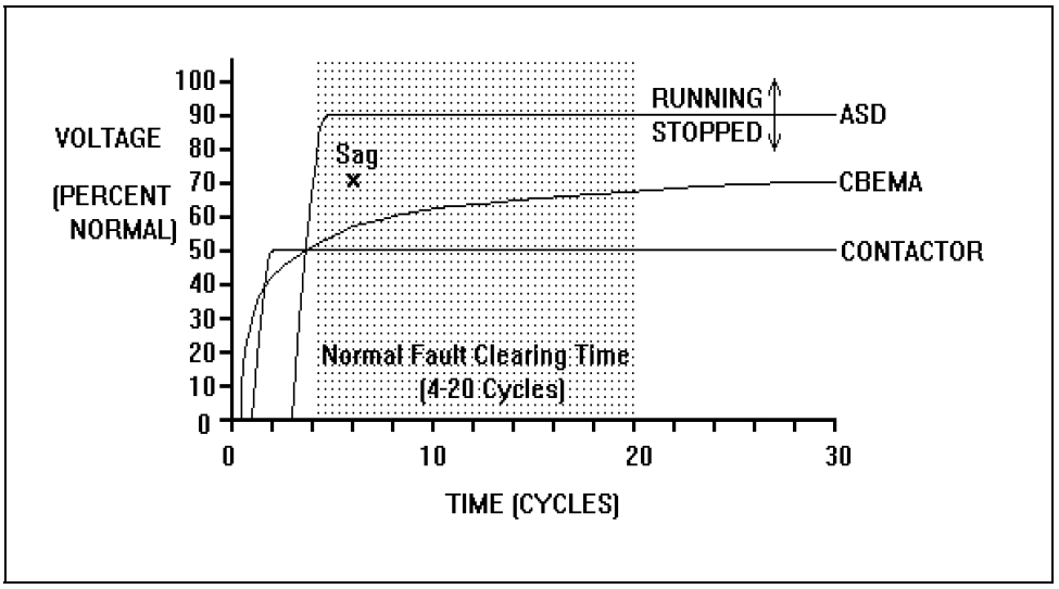 Since we characterize the voltage sags with a magnitude and duration, it is useful to describe equipment sensitivity in the same manner. This is done with a magnitude/duration plot (Figure 15). The Computer and Business Electronics Manufacturers Association (CBEMA) was the first to use this concept to describe equipment sensitivity. They came up with the “CBEMA curve” that has become the benchmark for describing equipment susceptibility. The curve is reproduced in IEEE Standard 446 (The Orange Book). Unfortunately, equipment doesn’t behave according to the CBEMA curve. Some equipment is less sensitive and some equipment, like the ASD in Figure 15, is much more sensitive. A working group in IEEE (IEEE P1346) is currently working on guidelines for compatibility of industrial process equipment.