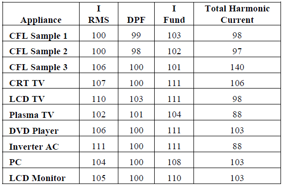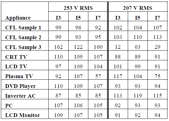 Table 4 shows that there is considerably more variation in individual harmonic current components than was observed for the current parameters shown in Table 4. Those appliances which showed the greatest variation in total harmonic current are also seen to have the most extreme variation in individual harmonic current components. The foremost of these is CFL Sample 3 where low order current harmonic behaviour shows extreme sensitivity to the input voltage magnitude.