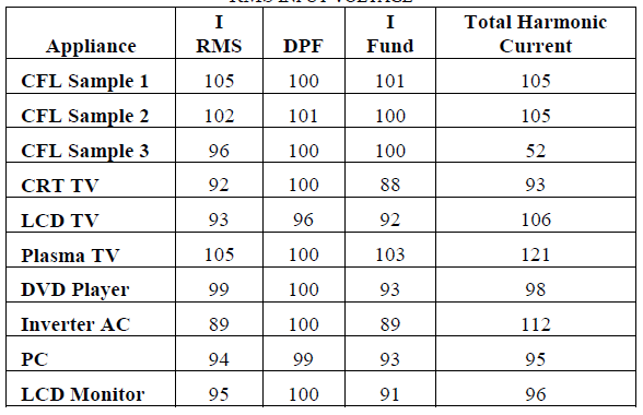 Table 2 shows the results of the first test (supply at 253 V RMS) for RMS current (I RMS), displacement power factor (DPF), fundamental current (I Fund) and the total harmonic current.