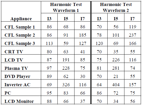 Table 7 shows the variation in low order individual harmonic current orders when harmonic test waveforms 1 and 2 are used to supply the appliances. It can be seen that there is considerable variation in all harmonic orders for most appliances.