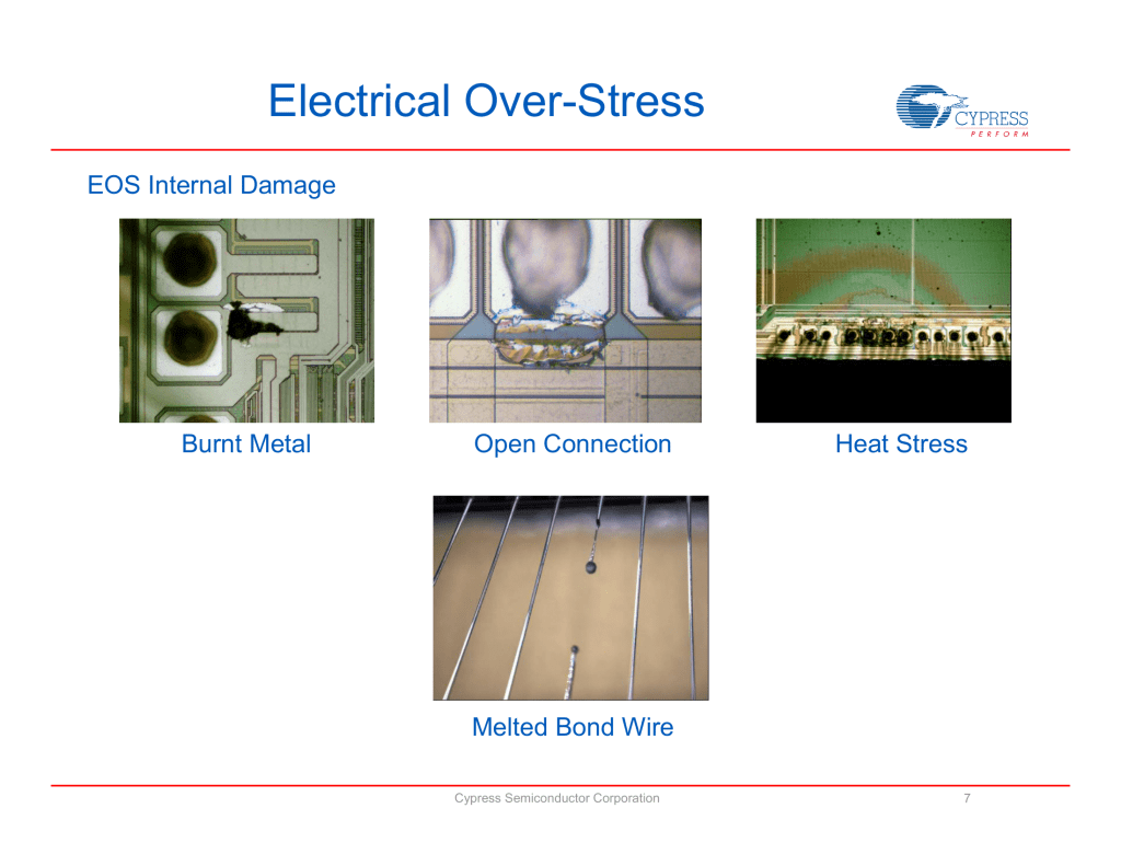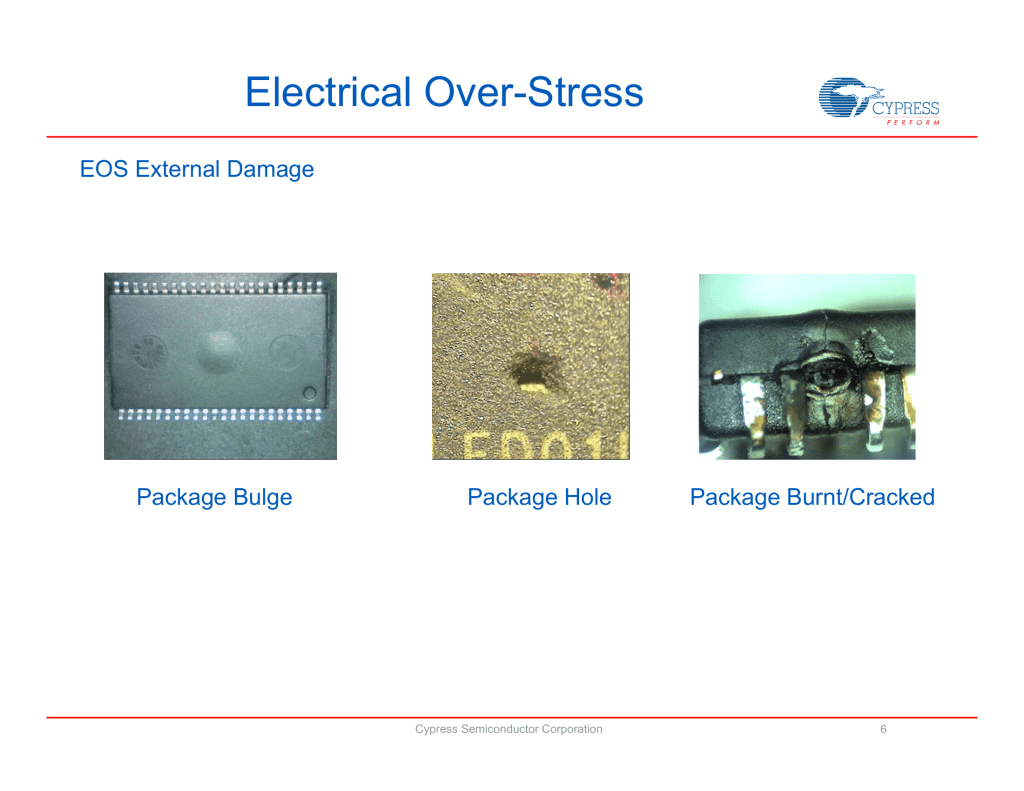 Electrical Over-Stress (EOS) is a term/acronym used to describe the thermal damage that may occur when an electronic device is subjected to a current or voltage that is beyond the specification limits of the device.