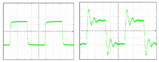At high frequencies the impedance matching is a must for most cases – impedance mismatch leads to signal distortions and ringing. The most typical output and input impedance of high-frequency instruments is 50 Ohms, although in some cases, such as TV cable, it may be 75 Ohms. Figure 1 shows the same signal measured with matched impedance (50 Ohms) and mismatched impedance (an oscilloscope set to 1M). As seen, mismatched impedance causes significant ringing of the signal and also readings of higher peak amplitude.