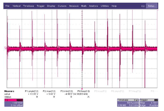 High-frequency noise in manufacturing environment is largely transient signals and repeatable pulsed signals. The waveform of the signals is quite different from the ESD Events. There is no sharp rise time; the ringing is frequently present and the signal is often periodic (Figure 7). The repetition of EMI signal is largely synchronized with one of the following: