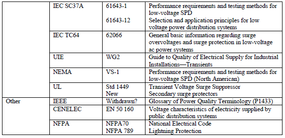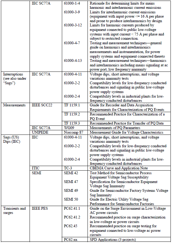 Table 2, provided by courtesy of EPRI-Power Electronics Applications Center, provides a listing of various power quality topics, the standards body working on the topic, the project reference, and the subject of the document.