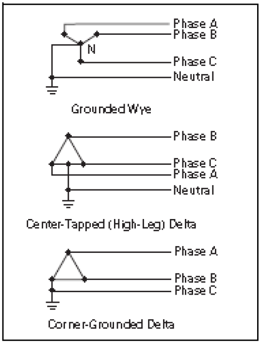 Solidly grounded three-phase systems (Figure 1.4-2) are usually wye- connected, with the neutral point grounded. Less common is the “red- leg” or high-leg delta, a 240 V system supplied by some utilities with one winding center-tapped to provide 120 V to ground for lighting. This 240 V, three- phase, four-wire system is used where 120 V lighting load is small compared to 240 V power load, because the installation is low in cost to the utility. A corner-grounded three-phase delta system is sometimes found, with one phase grounded to stabilize all voltages to ground. Better solution are available for new installations.