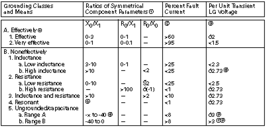 Table 1.4-2 taken from ANSI-C62.92 indicates the characteristics of the various methods of grounding.