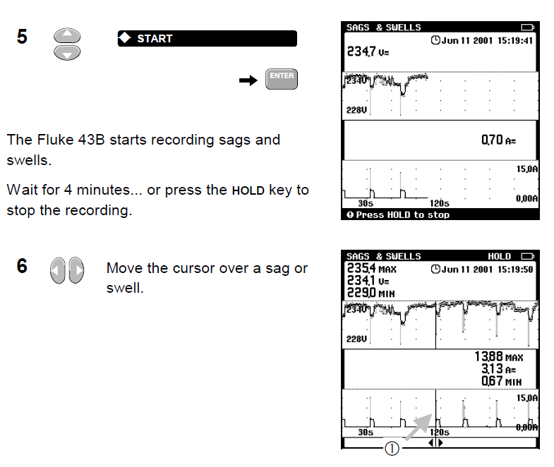 By recording the voltage and current, you can establish a possible relation between the two. For recording voltage and current, always use SAGS & SWELLS. Basically it does the same as the RECORD key, but it can record faster fluctuations. Use the RECORD key for all other combinations of readings you want to record.