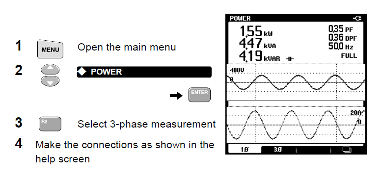 For balanced motors with a grounded Y-connection, you can read the Power Factor directly from the screen. To test for a grounded Y, simply check the three phase-to-ground voltages. If the voltages are stable and equal, then the system is wired as a grounded Y. Measure Power Factor as follows: