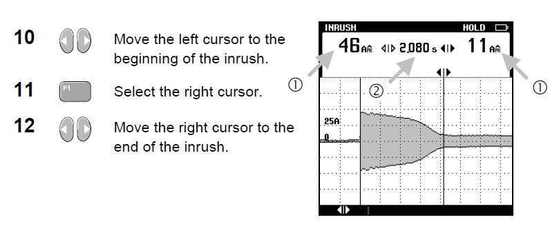 - Read the time between the cursors. Can fuses and breakers withstand the inrush current during this period? Fast acting breakers and fuses may trip.