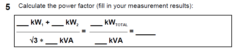 Write down the value for true power reading (kW2). If the power factor is smaller than 1, kW1 and kW2 will be different even if the load currents are equally balanced. Note that the apparent power (kVA) is equal to the first measurement.