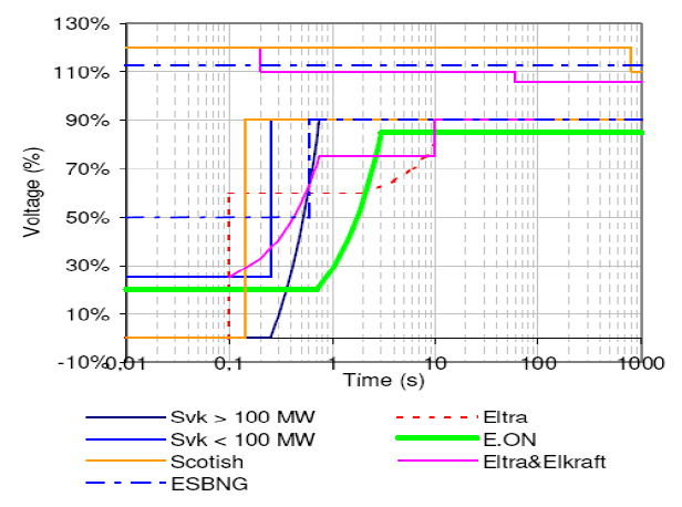 Grid codes define the responsibility of wind turbine owners and the technical requirements their wind turbines must meet in order for their turbines to be connected to the power system network. The codes also specify the responsibilities of the owners to protect their machines against damage caused by internal or external impacts, active and reactive power control, frequency control, voltage quality and external control [41]. The grid codes vary from one Transmission System Operator (TSO) to another and it focuses on the testing methods used in the verification of the fault ride through capability of the wind turbines and their behaviour during a grid fault. The Scottish grid code (SB/2 2002) requires a wind turbine with a non-synchronous generator to remain connected to the grid in the event of a zero-voltage grid fault for 140ms. The transmission utility from Germany, E.ON Netz, specifies requirements for wind turbines connected to transmission networks of 110 kV or above. This grid code states that wind turbines must not be disconnected from the network in the event of an 85% voltage dip caused by a three-phase short circuit for 150ms with voltage recovery to 80% within 3 seconds. The Danish system operator specifies grid code requirements separately for wind turbines connected to grids with voltages below 100 kV and above 100 kV which also specifies wind farms’ stability in the event of asymmetric grid faults and unsuccessful re-closure. Fig 1 shows the fault ride through requirements of different TSOs [42].