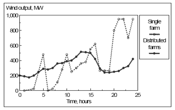 Fig 2. Smoothening impact comparison between a single farm and a geographically separated farm (both farm have 1000mw capacity) [23].