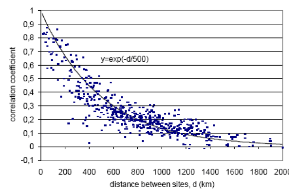 A study also reviewed that ten or more geographically separated wind farms connected together have a reliability of about 33-47% of their average output compared to a concentrated located wind farms [24]. This is better explain in Fig 2 [23] where the power output of a geographically distributed wind farms (GDWF) is compared to the same capacity (1000MW) of a single wind farm in western Denmark. The result shows that GDWF gives a better smoothening output power. Fig 3 explains the decreasing correlation between the wind turbine output power in respect to the distance between the site [51].This is extensively explained by Holttinen in [51].