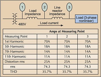 In another example, imagine the nonlinear load illustrated in Fig. 1 is an adjustable speed drive (ASD) or a nonlinear load connected to a 1,000kVA, 480V transformer. Current distortion is 25A, or 35.7%, for this drive. But as a percentage of the transformer capacity, the load is negligible. So the effect of powering this drive on the transformer, or on the generation of voltage distortion at the PCC, is insignificant.