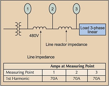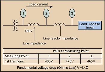 Voltage measurement is different. Fig. B (below) illustrates the principles of voltage measurement. Measuring in the direction of current flow, the voltage measured at any point is reduced from the voltage measured at a previous point by the product of the current and the impedance (I×Z.) The voltage drop across the system impedance reduces the voltage measured at Point 2. The voltage drop across the relatively high impedance of the line reactor further reduces the voltage measured at Point 3. As you can see, the farther you measure from the source, the more the voltage is lowered.