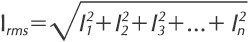 An electrical system supplies power to loads by delivering current at the fundamental frequency. Only fundamental frequency current can provide real power. Current delivered at harmonic frequencies doesn’t deliver any real power to the load. When current of a single frequency is present in a system, you can use the measured values in Ohm’s Law and power calculations (see Sidebar below). However, when currents of more than one frequency are present, direct addition of the current values leads to a summed value that doesn’t correctly represent the total effect of the multiple currents. Instead, you need to add the currents in a manner known as the “root mean square” summation. The equation for the rms addition of currents is as follows:
