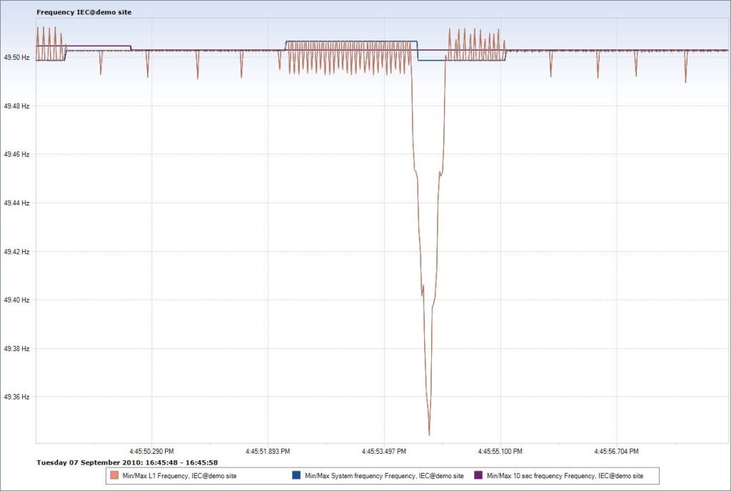 Measurement resolution of Power frequency is set to 10sec with uncertainty of 10mHz over measuring ranges of 42.5 – 57.5Hz / 51 – 69Hz at 50/60Hz respectively. Aggregation intervals are not mandatory for this section. In some application the required resolution is not sufficient and higher resolution as 1 cycle (power generation), 10/12 cycles (wind turbines) and 1sec (in some national standard) are required. The image below shows reading variations of the same signal measured in different resolution:
