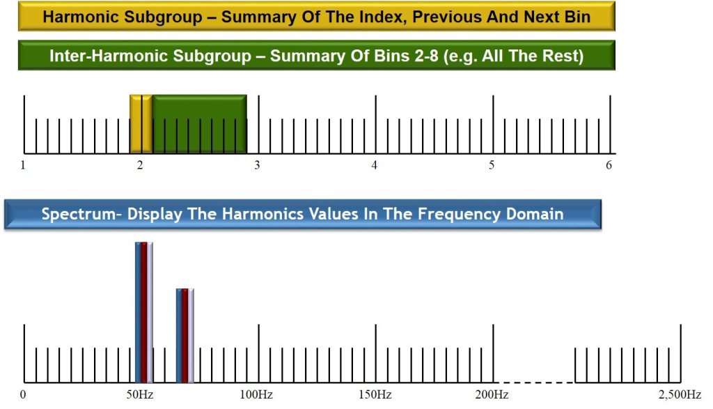 IEC 61000-4-30 adopt the 10/12 cycles gapless harmonic subgroup measurement from the IEC 61000-4-7. It means that the FFT window is 10/12 cycle and the harmonic components output (bins) are at 5Hz resolution. The output component for each 5Hz bin is grouped according to the image below: