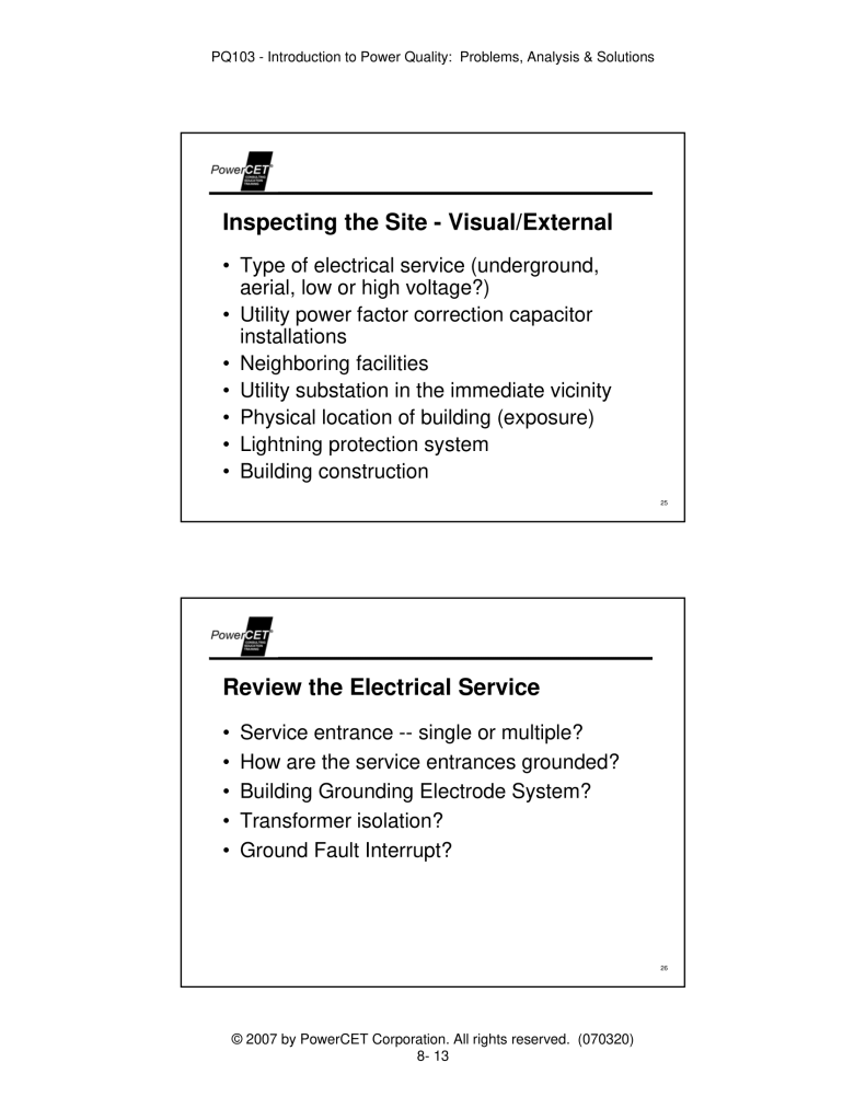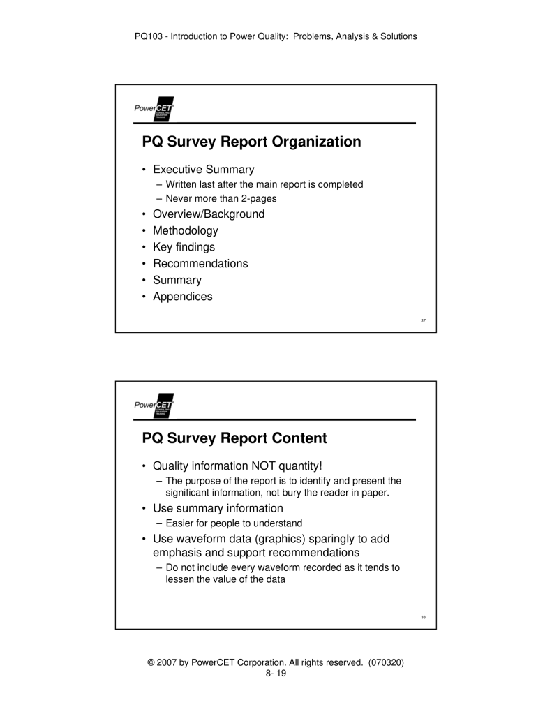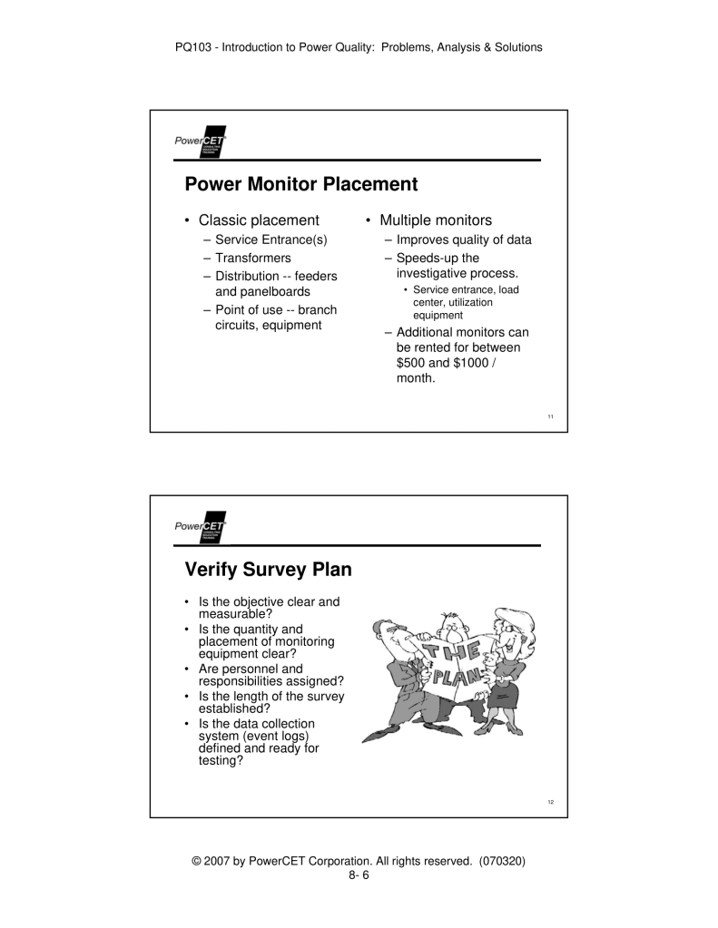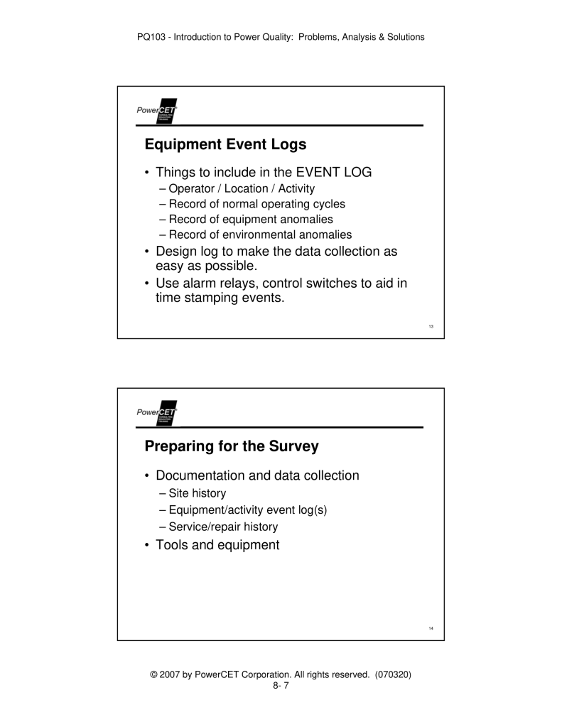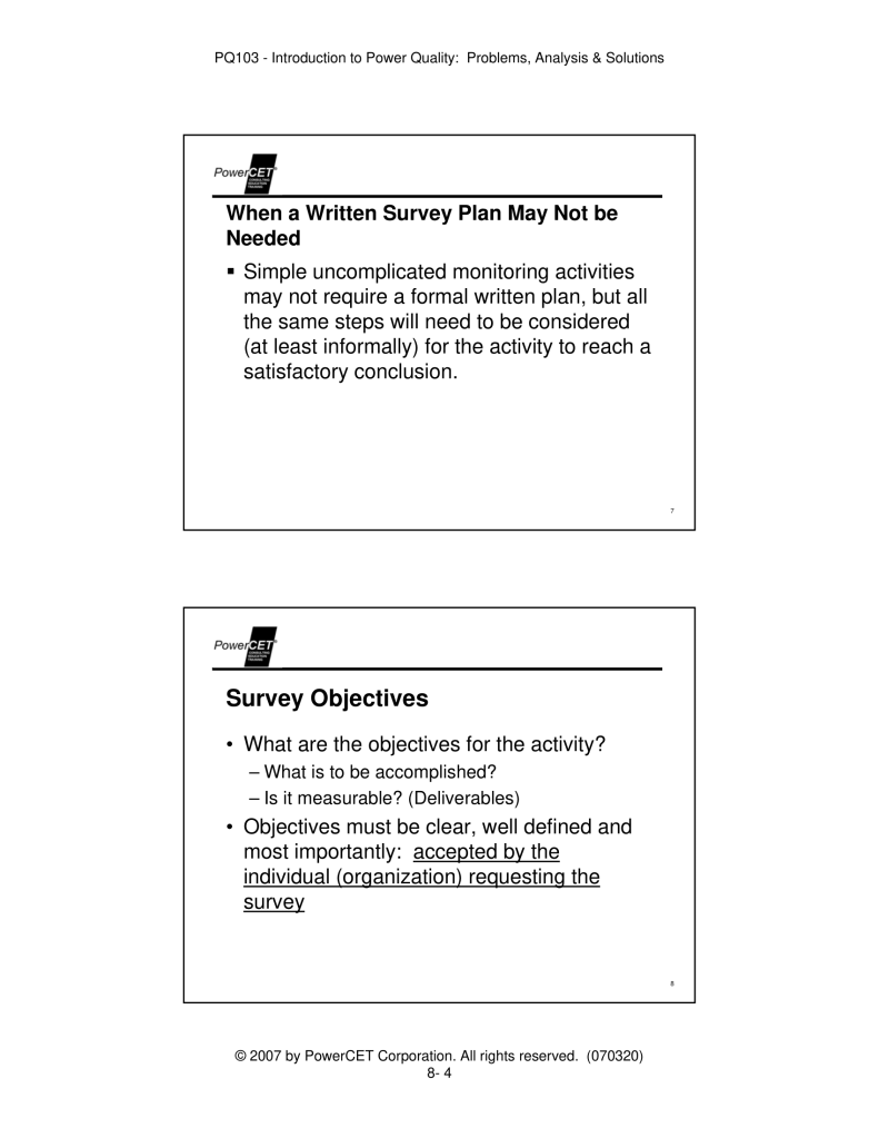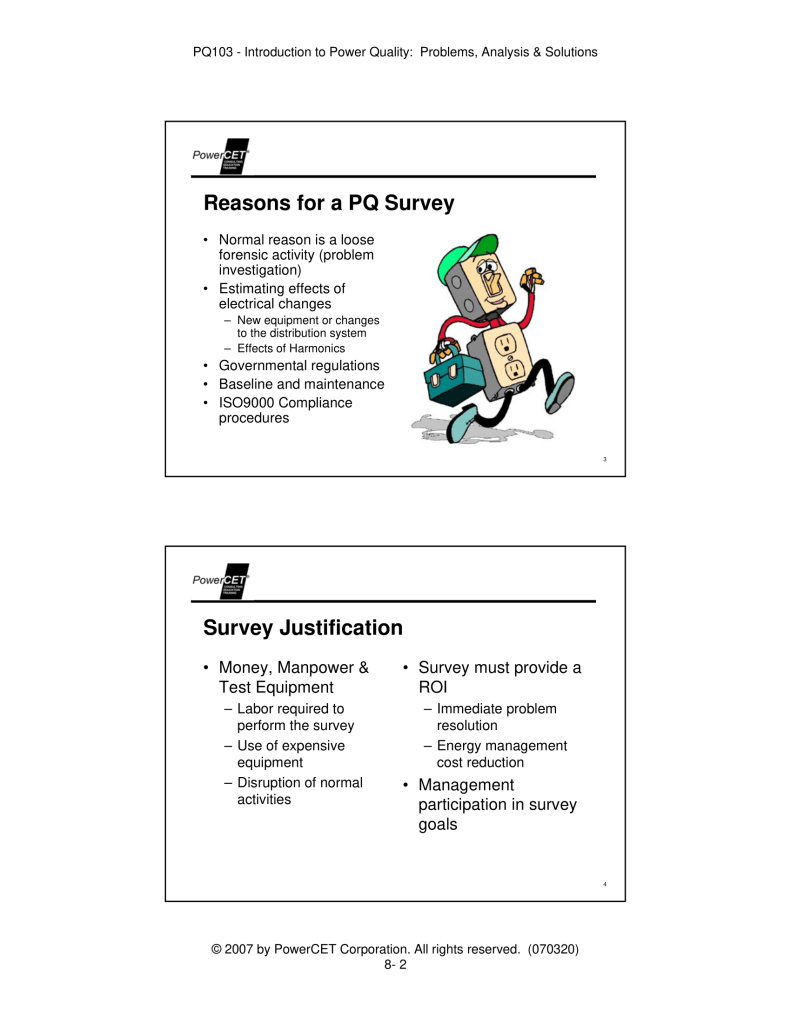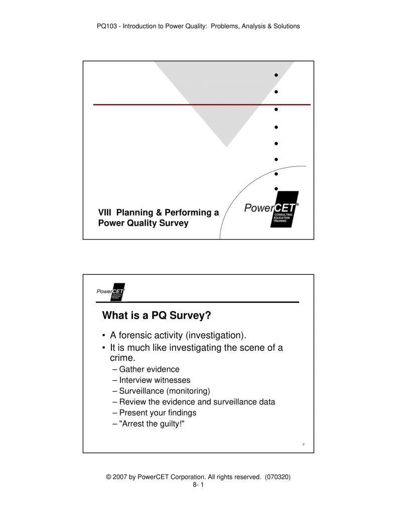 Published by PowerCET® Corporation, Course: PQ103, 2007. Introduction to Power Quality: Problems, Analysis & Solutions – Planning & Performing a Power Quality Survey.