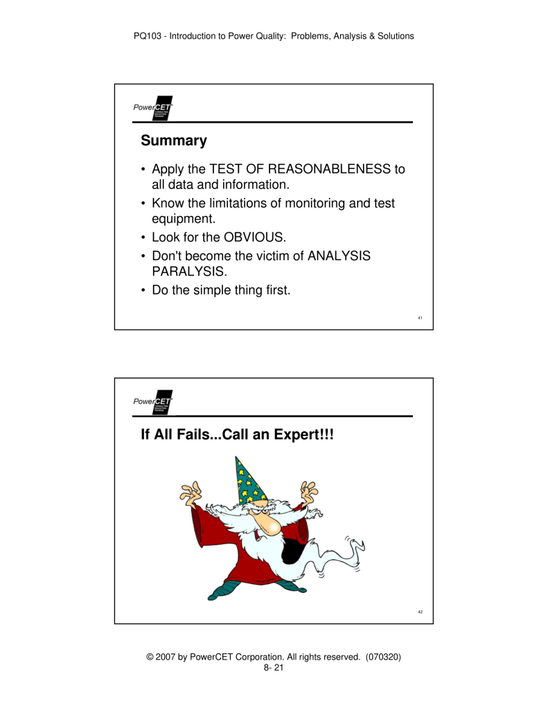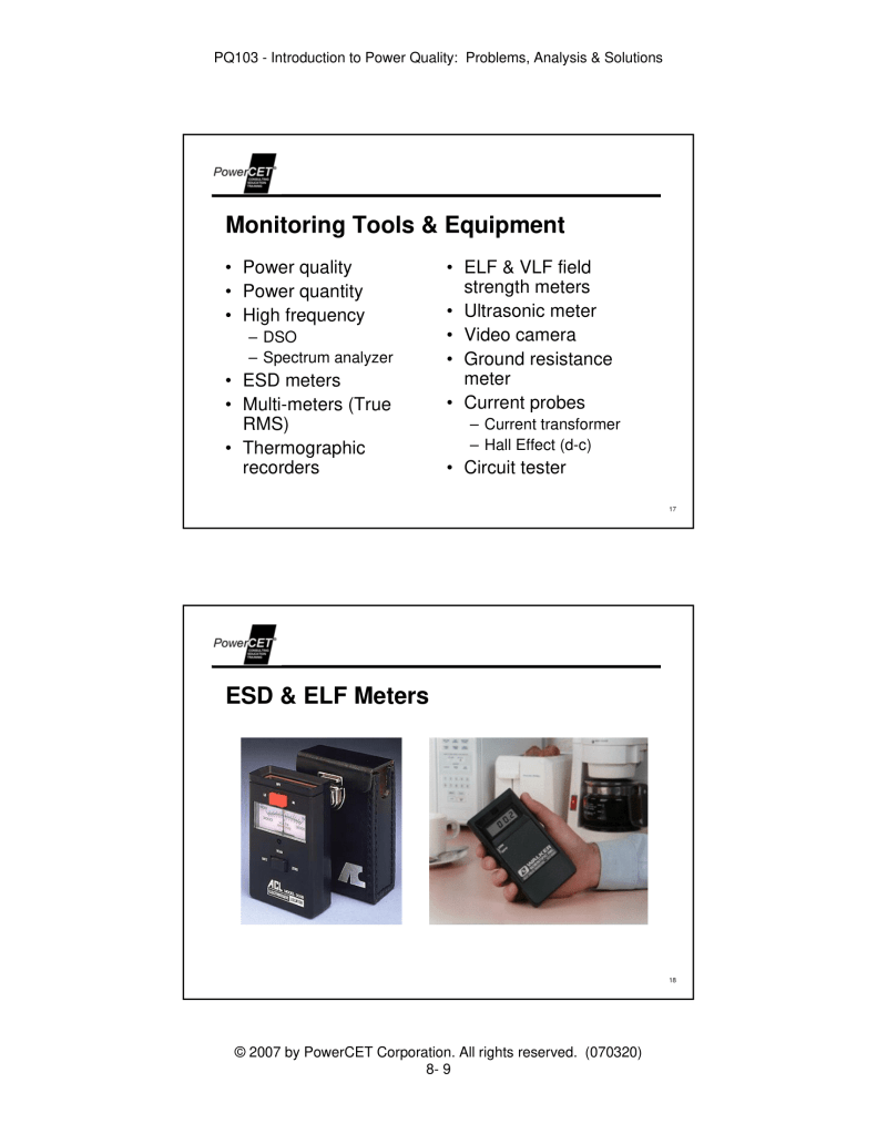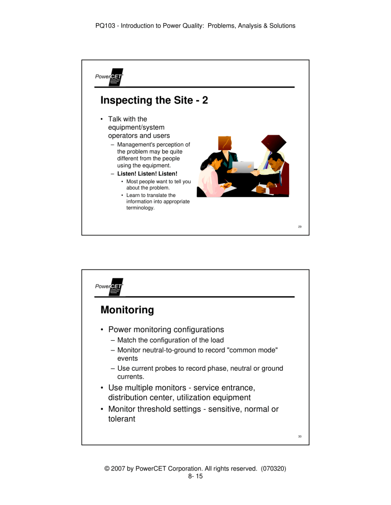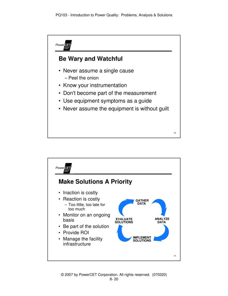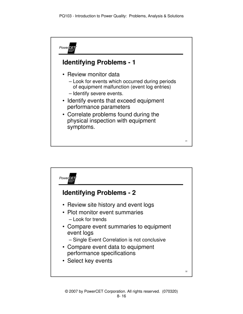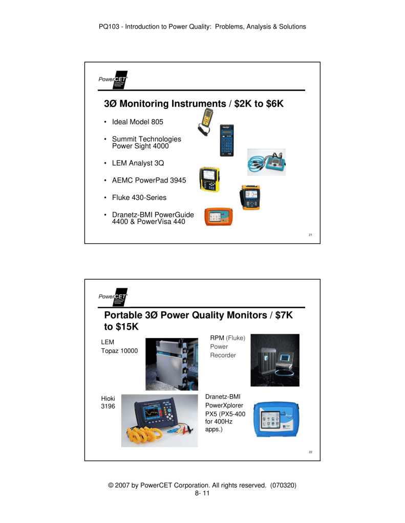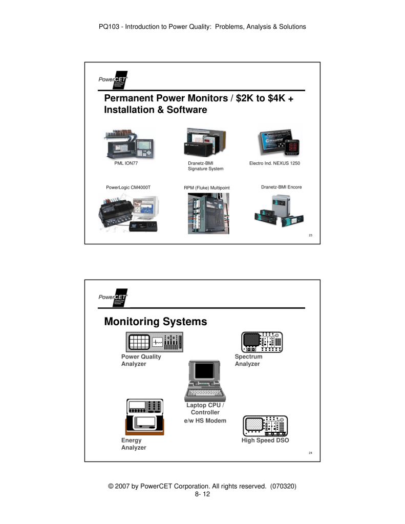 Published by PowerCET® Corporation, Course: PQ103, 2007. Introduction to Power Quality: Problems, Analysis & Solutions – Planning & Performing a Power Quality Survey.