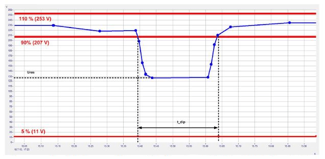 A voltage event will be recorded with the concerning voltage value (minimum for dip and interruption or maximum for swell) together with the corresponding duration of the event (see Figure 4).