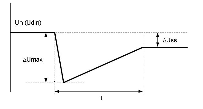Rapid voltage changes are characterized by voltage change ΔUss (new steady state voltage magnitude), the maximum deviation ΔUmax and the event duration T (see Figure 6). ΔUmax has to be smaller than ±10 % of Udin or Un, otherwise the event becomes a voltage dip or swell classification.