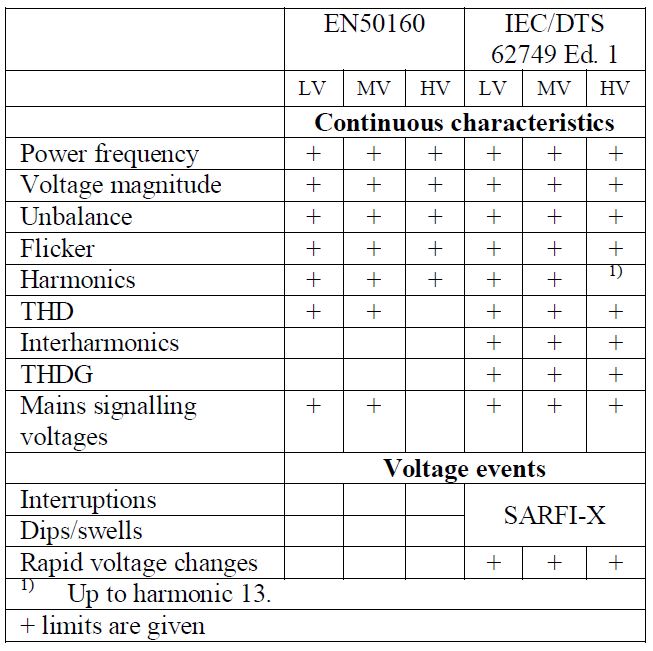Voltage characteristics are derived from continuous records with defined observation intervals (day or week) as well as from detected voltage events. The standard EN 50160 Voltage characteristics of electricity supplied by “public distribution networks” is a European standard which specifies and defines main characteristics of the voltage at the point of connection under normal operating conditions. Technical Specification IEC/DTS 62749 Assessment of power quality – Characteristics of electricity supplied by public networks extends the set of limits defined in EN 50160 and takes current trends additionally into account. Table 1 shows the coverage of limits for voltage characteristics for low voltage, medium voltage and high voltage networks (LV, MV, HV).