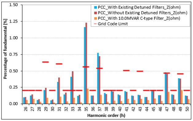Although the site is equipped with detuned harmonic filters, the historical harmonic measurements taken in 2019 and 2020 demonstrate that there are still harmonic limit exceedances at the 21st, 23rd, 25th, 33rd, 35th, 37th and 45th harmonic orders against the Grid Code requirements in the UK.