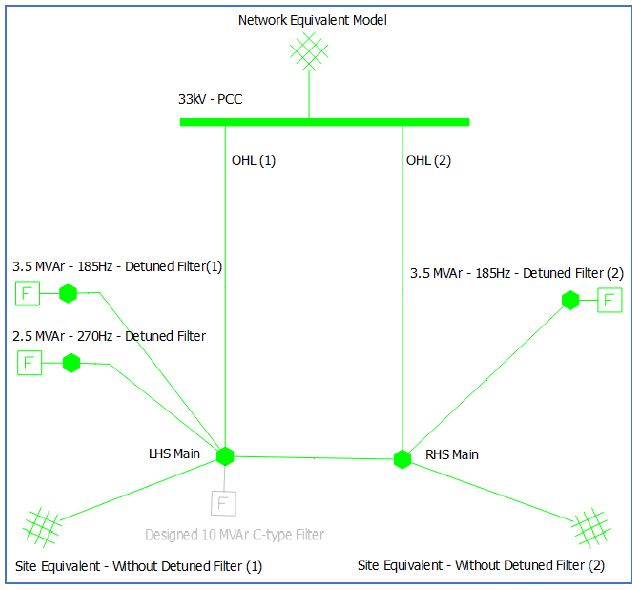 The industrial site included a total capacity of 100 MW smelters and 80 MW hydropower generators. The smelters were equipped with 2.5MVAr and 3.5MVAr detuned filters tuned at 185Hz and 270Hz. The site was connected to a 33kV Point of Common Coupling (PCC) via two parallel lines. To capture the network impedance profile accurately, the entire 33kV substation was modelled using IPSA 2.9 software package, this was done back to the 400kV network which is the point further additions did not lead to a significant change in the impedance as seen from the point of interest. A simplified Single Line Diagram (SLD) of the developed model is given in Figure 1.