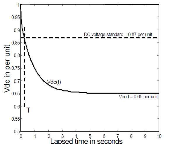 As an example, let the voltage standard be Vdc ≥ 0.87. Then the Vdc excursion becomes unacceptable at T when Vdc = 0.87 in Equation (1). Solution for Vend in terms of t = T in this expression gives