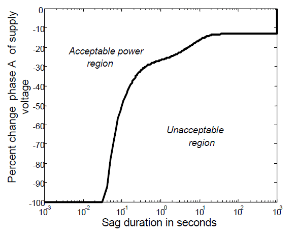 The best known of the graphical metrics for bus voltage sensitivity is the Computer Business Equipment Manufacturing Association (CBEMA) curve which is a graphic depicting the severity of a distribution bus voltage sag, Δ V, versus its duration T. The Δ V-T plane is a two dimensional space in which the line Δ V = 0 represents the case that distribution voltage is at rated value, and the Δ V < 0 half-plane is the bus voltage sag region. Overvoltage and undervoltage events of very minimal impact (small | Δ V | ) are considered ‘acceptable’ in the sense that loads are not disrupted; further, very short duration events (small T) are considered acceptable. Thus the Δ V – T plane is divided into acceptable and unacceptable regions. Fig. (1) shows the CBEMA power acceptability curve. The CBEMA curve depicted in Fig. (1) has Δ V indicated as a percent of rated voltage, and T shown on a logarithmic scale in seconds.