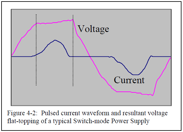 The SMPS is not without its downside, however. The operation of the diode bridge and accompanying smoothing capacitor is very non-linear in nature. That is, it draws current in non-sinusoidal pulses at the peak of the voltage waveform (see Figure 4-2). This non-sinusoidal current waveform is very rich in harmonic currents.