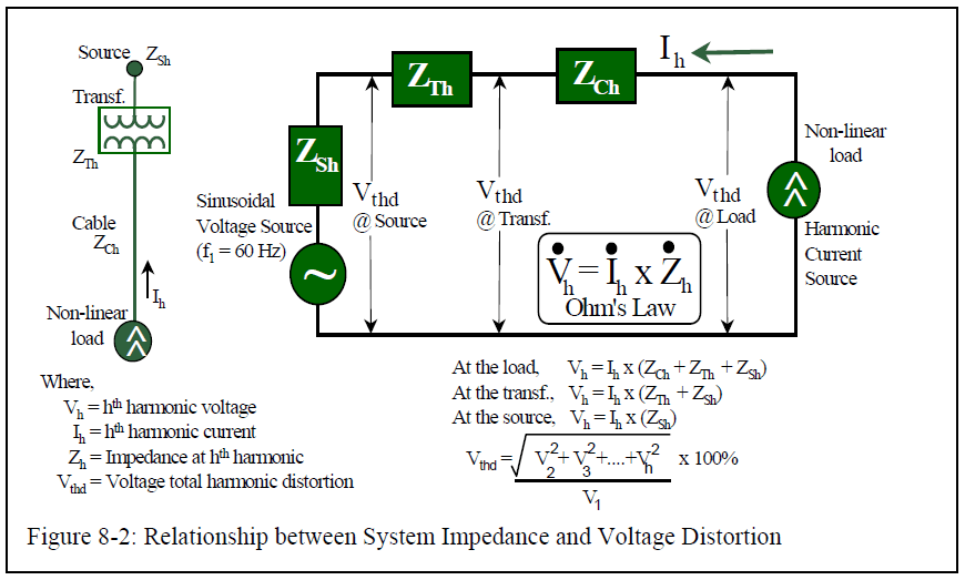 Figure 8-2 shows the relationship between system impedance and the voltage and current distortion components at several points in a typical power system.