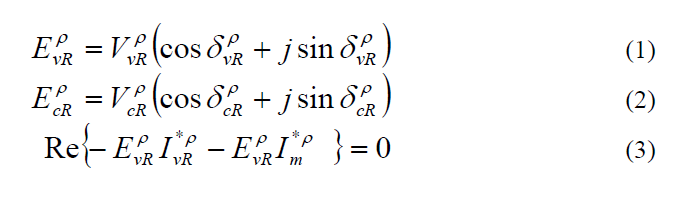 The UPFC equivalent circuit shown in Figure 3 consists of a shunt-connected voltage source, a series-connected voltage source, and an active power constraint equation, which links the two voltage sources. The two voltage sources are connected to the AC system through inductive reactances representing the VSC transformers. In a three-phase UPFC, suitable expressions for the two voltage sources and constraint equation would be: