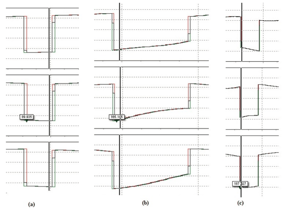 Figure 16 represents the three-phase symmetrical voltage sag at 40%, 70%, and 80% when fed to a three phase—3.3 kW and 16 A with a DC generator as a load via a regenerative grid simulator. The measurement summaries are given below: