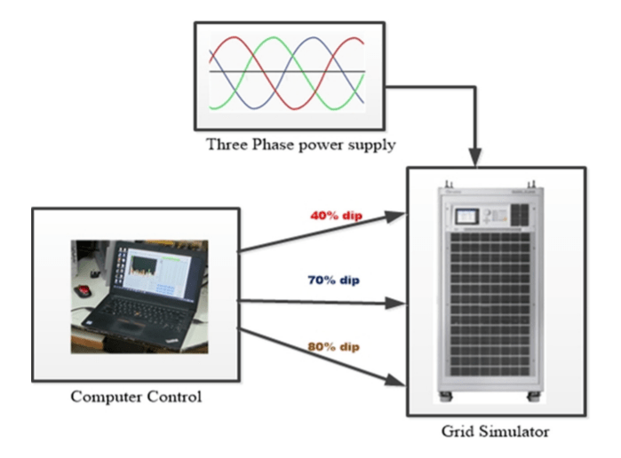 A regenerative grid simulator may be used to modify essential parameters in order to replicate a reliable distribution grid/network conditions and settings, as illustrated in Figure 2. In single and three phase modes, variations in voltage amplitude, frequency, voltage dips, and phase angle are all maintained [9-12]. Simulating balanced and unbalanced situations (three phases) is simple. This simulator also satisfies IEC regulatory requirements 61000-4-11, which is a requirement for the AC supply [13-15]. The measurement accuracy of the Regenerative Grid Simulator are: Voltage—0.2% + 0.2% F.S, Current (RMS)—0.4% + 0.3% F, Current (Peak)—0.4% + 0.6% F.S, and Power—0.4% + 0.4% F.S.