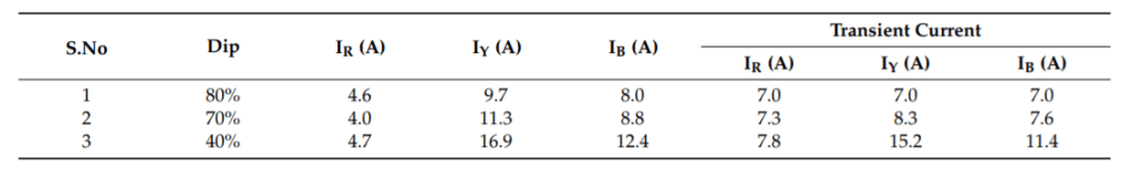 Table 5 represents the symmetrical sag test on a three phase, 415 V, 5 Hp, 7.8 A induction motor when delta connected under loaded conditions, and star connected under loaded conditions with and without neutral connections, respectively.
