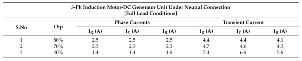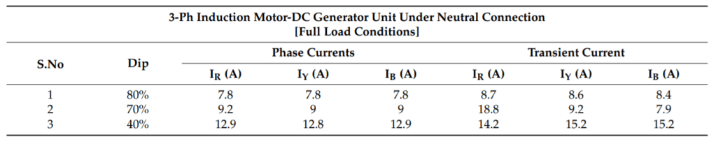Figure 6 represents the test setup of the DC generator-coupled induction motor when subjected to a single-phase sag in one of the three phases of the AC supply, which was created in the regenerative grid simulator. The tested results under loaded conditions with and without neutral connection are tabulated in Table 1 and Table 2.