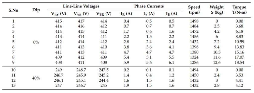 Table 6 represents the results of star connected(non-neutral) three phase—7 kW, 7.8 A induction motor under loaded conditions, which are tested with a 40%, 70%, and 80% sag. Under 40% sag, the load can be maintained up to 2.8 kg, which leads to a huge rise of the line current. Under 70% sag, the load can be maintained up to 3 kg, which leads to a huge rise of the line current. Under 80% sag, the load can be maintained up to 3.2 kg, which leads to a huge rise of the line current.